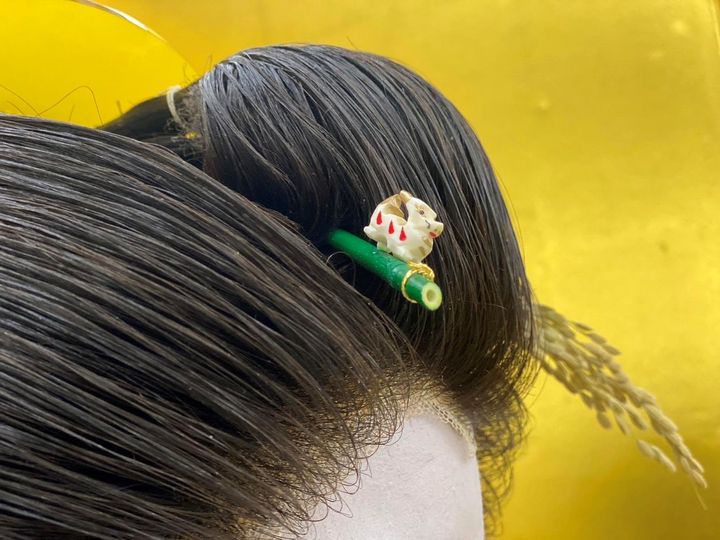 反対側には、その年の干支のかんざしをさします。動物の色や竹の色も様々あり、それぞれが好きなものを選んで注文するのが毎年の楽しみです。