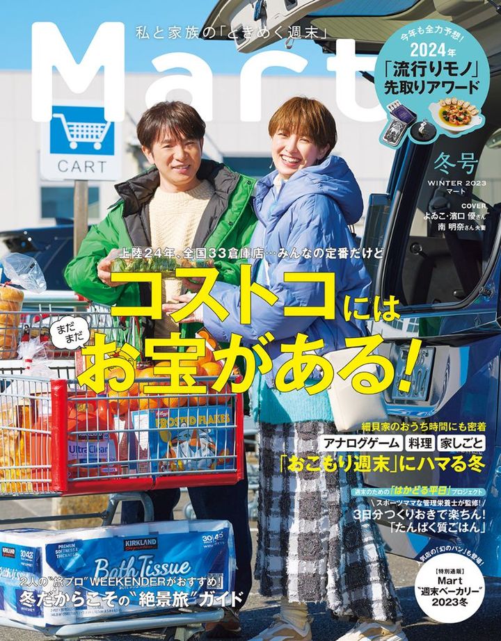 2023年12月27日に発売された『Mart』冬号(光文社)の特集は、年に一度の大特集「コストコにはまだまだお宝がある!」。表紙を飾った濱口優さん&南明奈さん夫妻のクルーズに密着したほか、コストコインフルエンサーの一目ぼれアイテム、コストコ食材だからこそできる「イベントごはん」レシピ、そして恒例の出口調査まで、50ページにわたって大特集している。