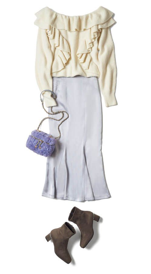 波打つフリルで顔まわりを愛らしく彩って。あくまでセンシュアルになりすぎないオフショルを目指したいから、フリルあしらいで可愛げを加味したニットは正解チョイス。波打つ立体感とのメリハリで、デコルテが華奢見えするメリットも享受できます。光沢素材のスカートを合わせる異素材コーデで、奥行きある着こなしに着地を。