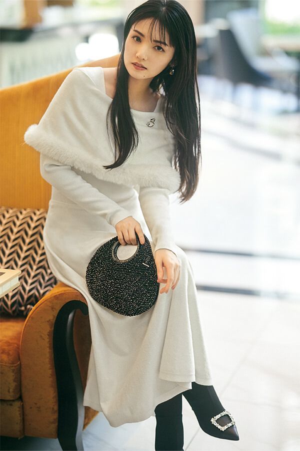 プレーンなワンピには、印象が華やぐケープファーでエレガントさの底上げを。胸元のブローチでさらにモノトーンルックをランクアップ! さらに、ジュエルバックルが目を引くブーツで華やぎよく仕上げて。