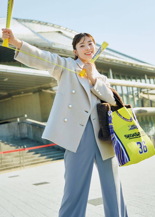 冬でも関係なく推し活は盛ん♡ ベージュコートとブルーパンツで、スポーティー気分な爽快配色に。屋外ではコートのインに保温ベストを。会場内ではサッと脱げるので、汗ばむ心配なく快適です。