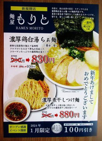2024年1月限定で、”濃厚煮干しつけ麺”と”濃厚鶏白湯らぁ麺”が100円引きです。