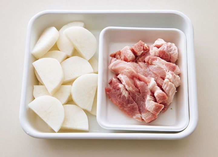 大根は皮を厚めにむき、幅1cmの半月切りにする。豚肉は赤身と脂身の間に切り目を入れて筋を切り、横に幅1.5cmに切る。Aは混ぜる。