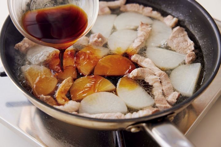調味料は大根が柔らかくなってから加えるのがコツ。こうすることで豚肉が堅くならず、大根にも味がしっかりしみて、おいしく仕上がりますよ。