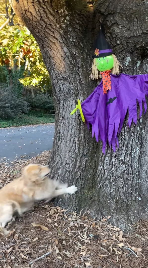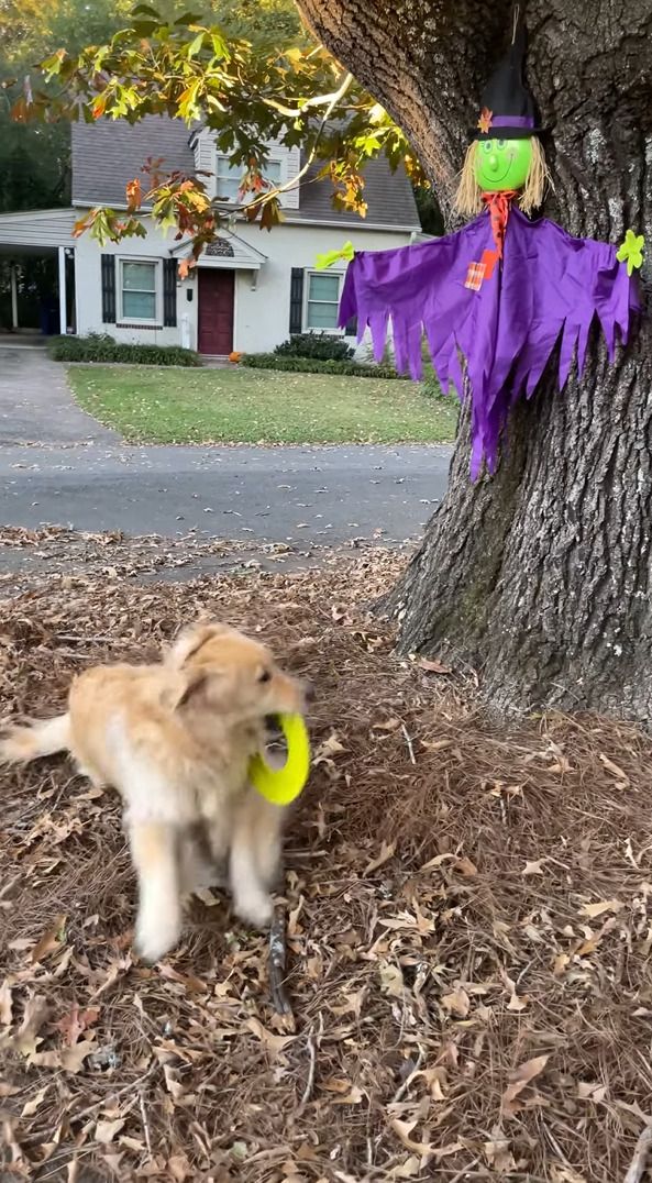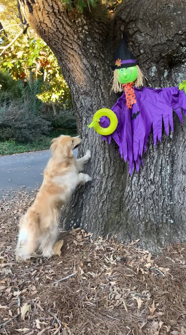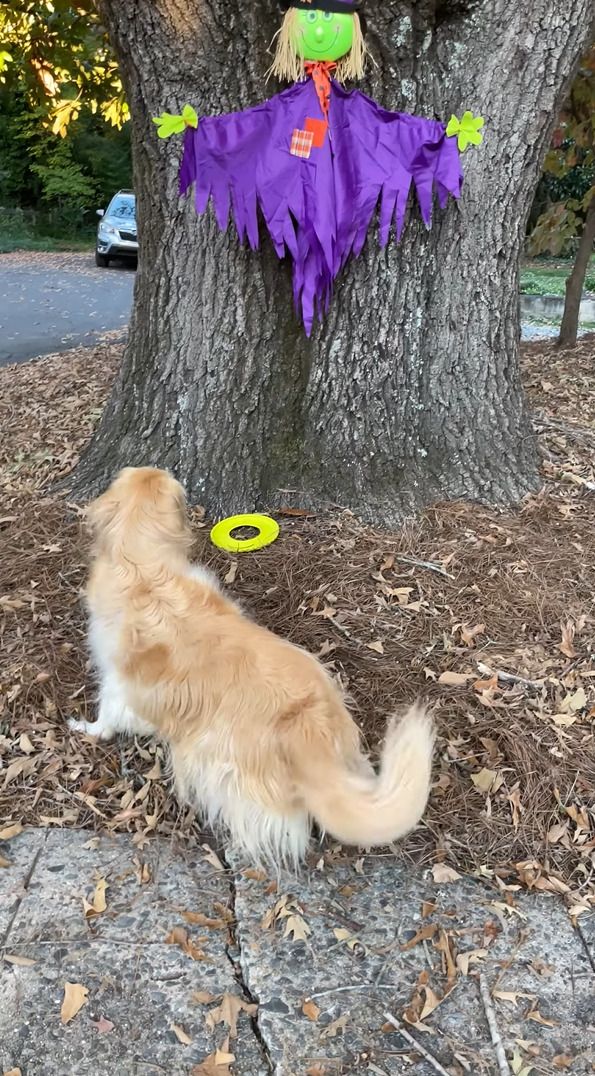 フリスビーを発見したので、遊びたいなと思っている様子のゴールデンリトリバー。 しかし、そのフリスビーはハロウィンに飾り付けされた魔女のかかしが持っていました。