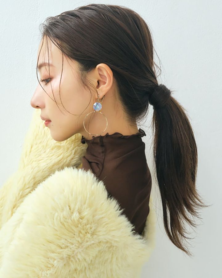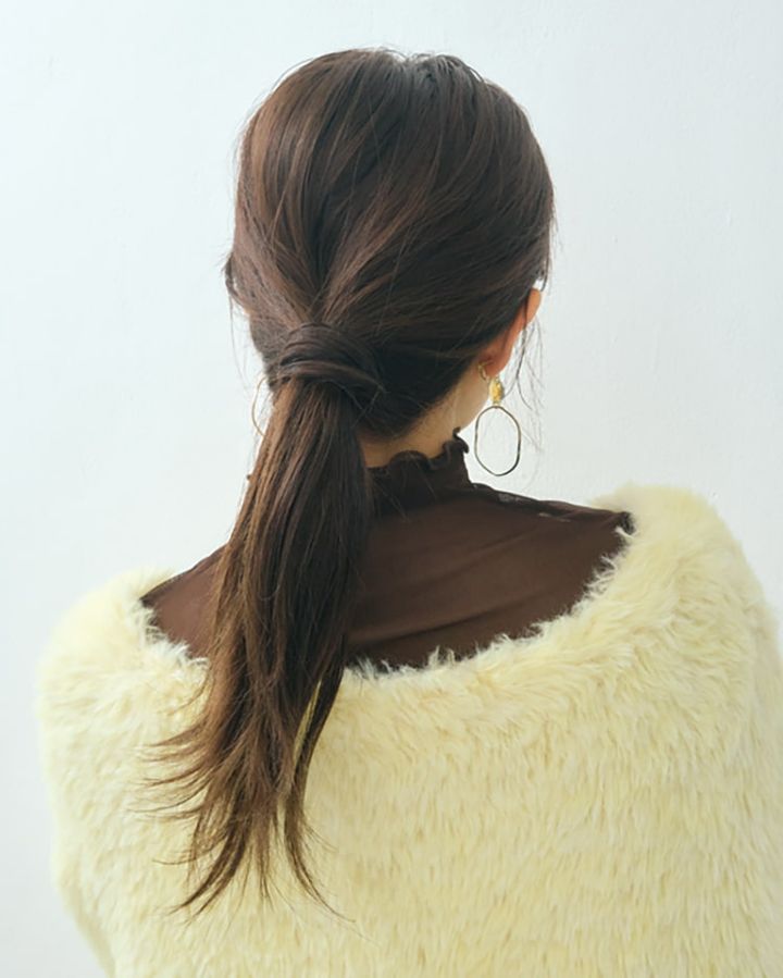 顔まわりのおくれ毛を左右ちょっとずつ引き出してから、手ぐしで髪をひとつにまとめる。まとめた髪は低めの位置で結んでおく♡