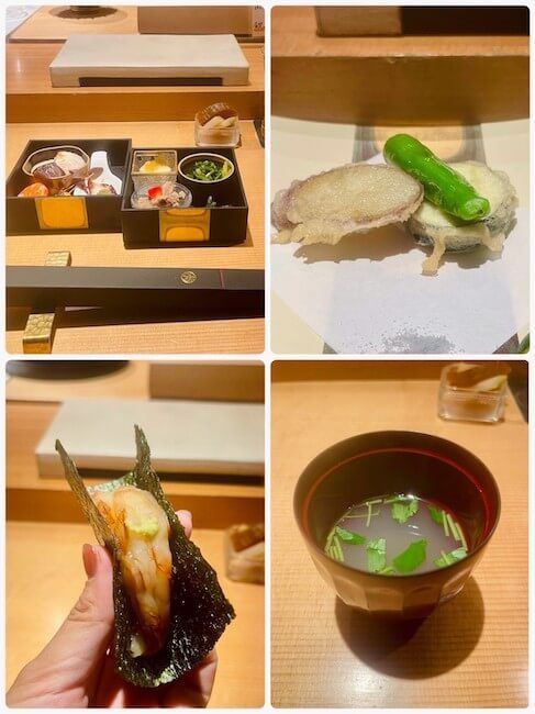 私がいただいたコースでは、一品料理に始まり握り12前後、天ぷら、椀、巻物などをいただきました。