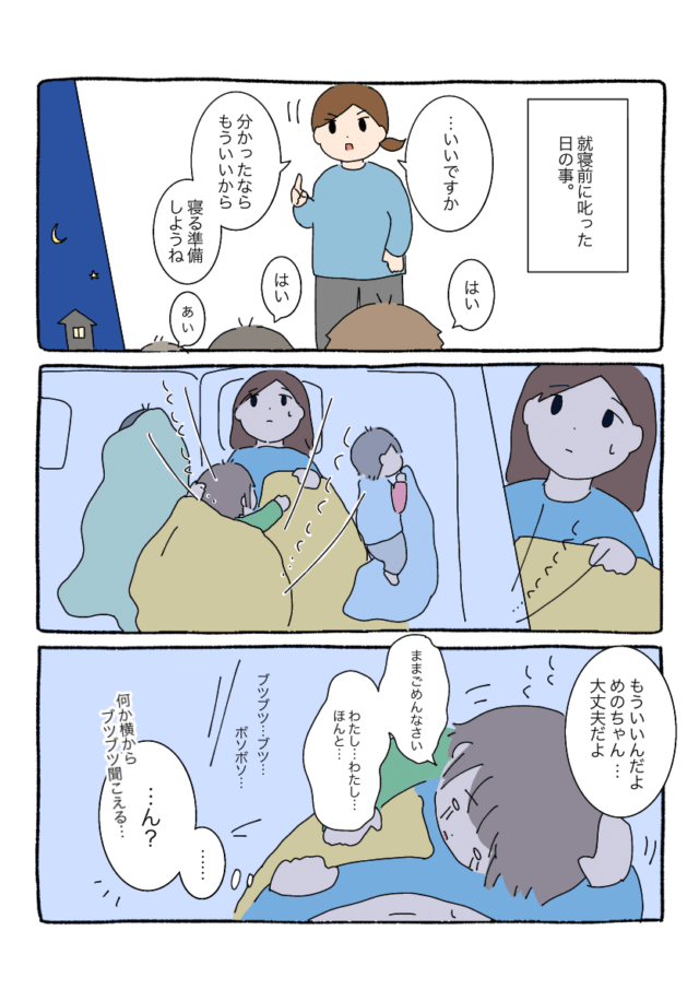 5歳めのちゃん、3歳なのちゃん、1歳ゆのくんの3人のお子さんを育てるめめさんから、三人の子ども達の個性が光った出来事のお話が届きました。ある日、なかなか寝ようとしない子ども達を叱っためめさん、何とも言えない空気のまま布団に入ったそうなのですが・・