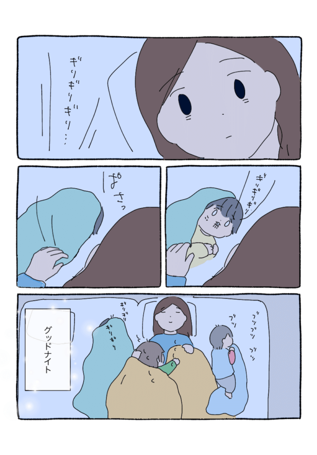 「ままちらい」が地味に刺さるな・・。モヤモヤしたのも吹っ飛んだ三者三様の寝かしつけ事情|めめの育児絵日記