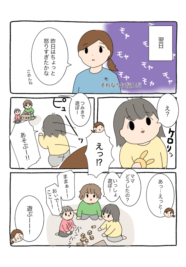 あはは!みんな切り替えが早い!(笑)叱った方が拍子抜けしてしまいますよね~!でも・・個性溢れるにぎやかな三人の姿にキュンキュンしてしまいました。