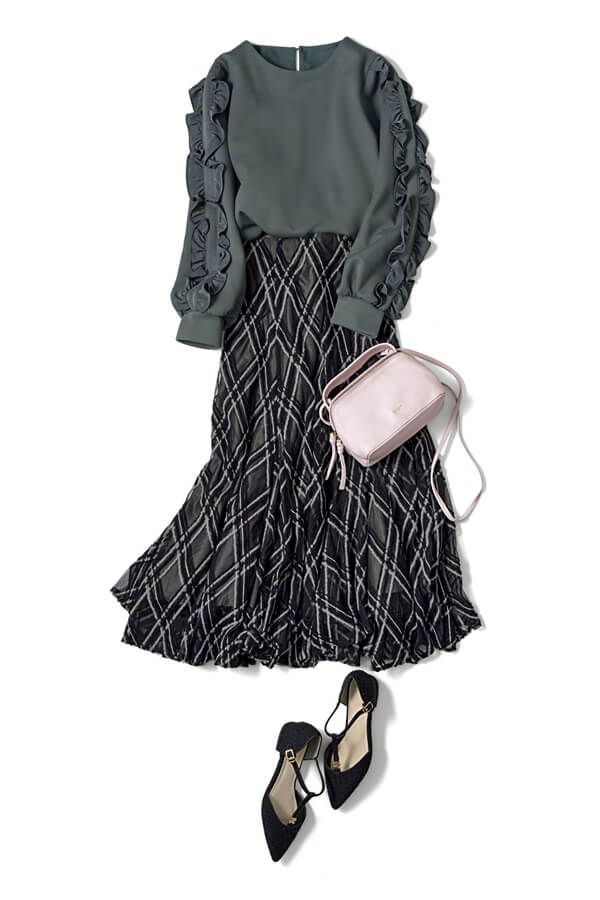 顔まわりに持ってくると甘く見えがちなフリルも、モノトーンならちょうどいい華やぎ。変形チェックスカートで表情をつけてシャレ感よく。