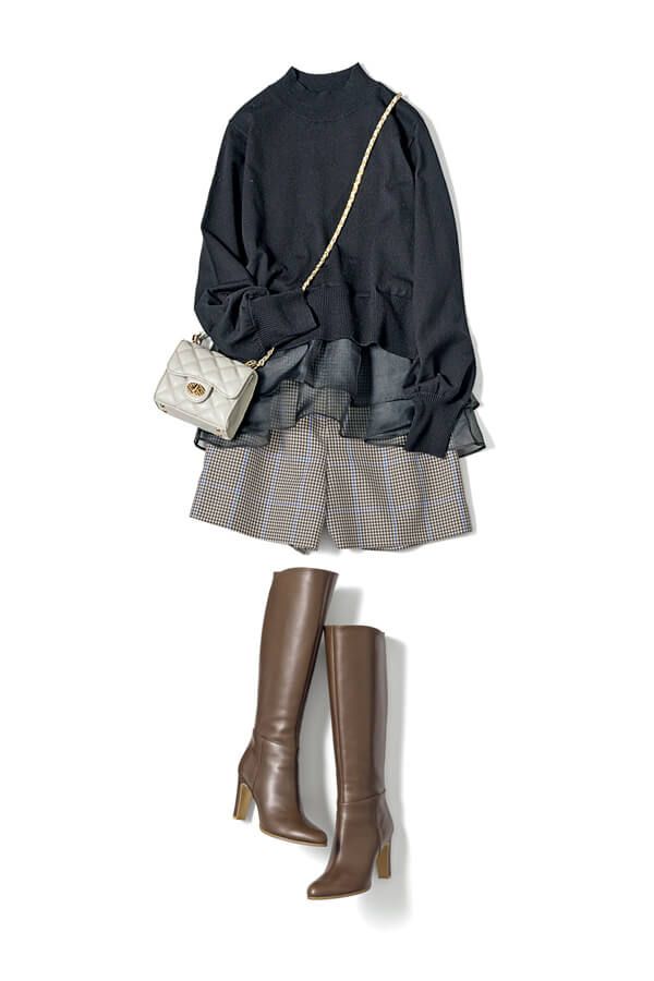 ショーパンのロングブーツでモノトーンの鮮度を高めて