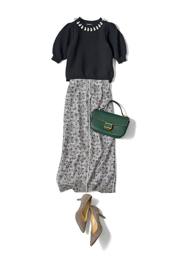 アクセいらずで黒ニットが華やぐパール付きトップスもモノトーンスタイルをクラスアップさせる要因に。女性らしさはフラワーレースに託して。