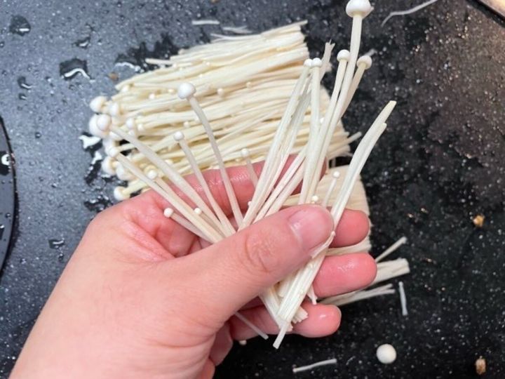 えのきは石づきを切り落とし、手でほぐします。しいたけも石づきを切り落とし、少し厚めに切ります。