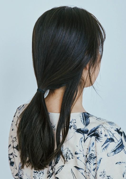 1. 顔まわりにたっぷりおくれ毛を残し、左右の耳後ろからも毛束をとり分けておく。それ以外の髪を首後ろでゴムでひとつに結ぶ。