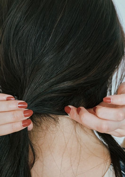 2. 1のゴムをそのまま2〜3cm下にずらす。ゴムの上の部分から髪を引き出してゆるさを出す。最後にゴムの上からシュシュを結ぶ。