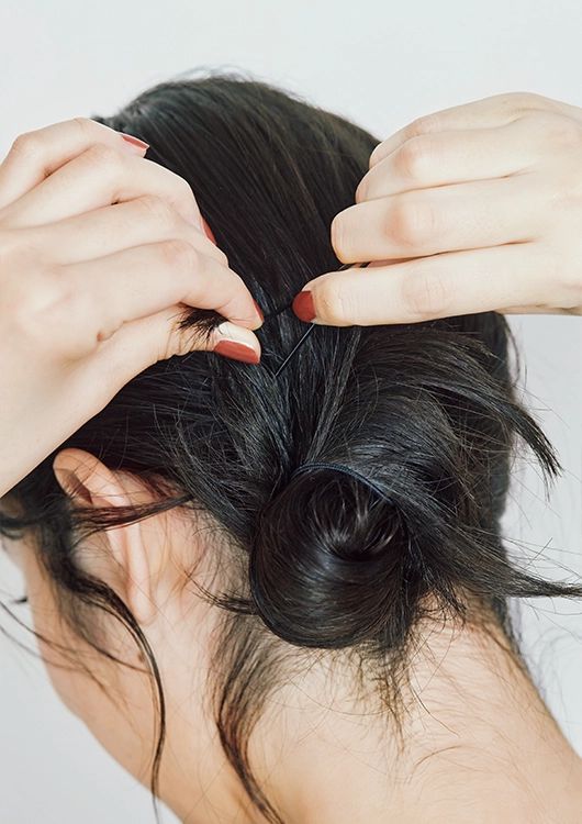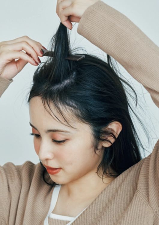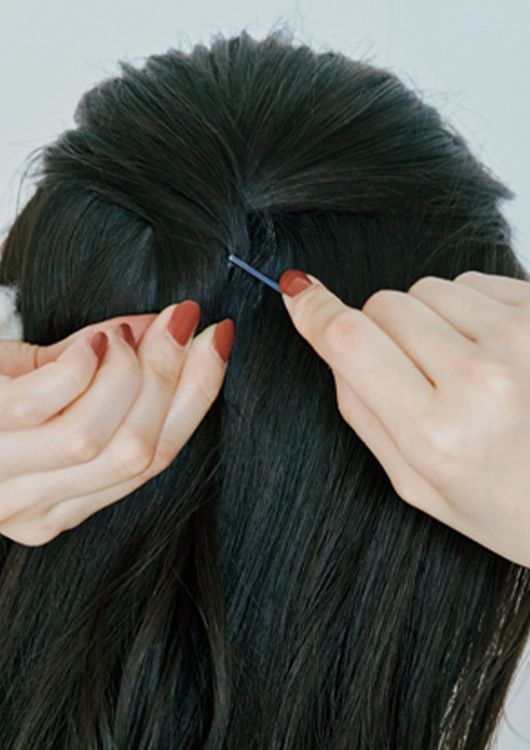 1. ハチ上の髪をとってまとめ、後頭部の中心で1回ねじってピンで留める。トップの髪を軽く引き出して、立体感を出しておく。