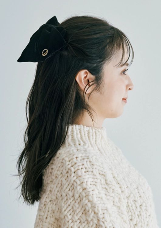 ビッグリボンクリップ¥8,800/Chapeau d’ O 東急プラザ銀座店 ニット¥37,400/Stola. パールネックレス¥27,500/ステラハリウッド リング¥45,100/ココシュニック
