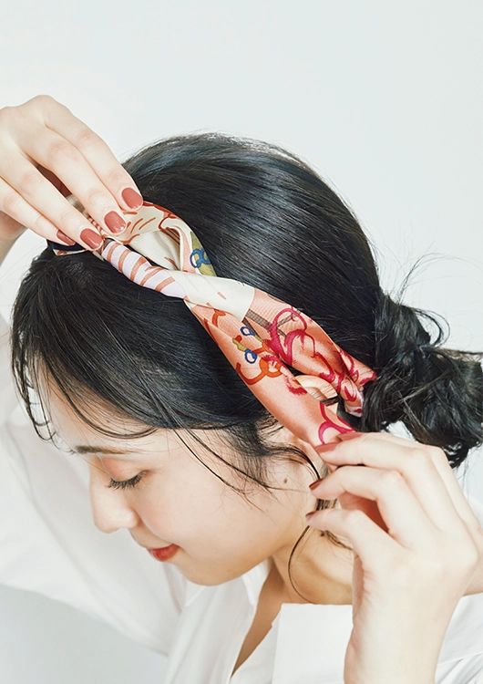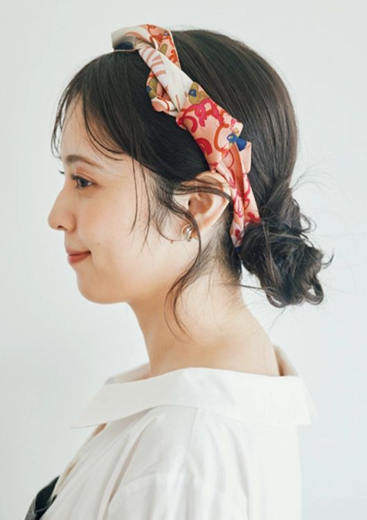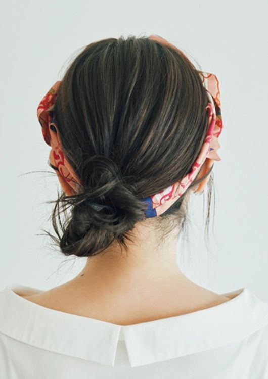 カジュアルなシニヨンをスカーフでリュクスな雰囲気に格上げ。シンプルコーデのアクセントにも有効です。