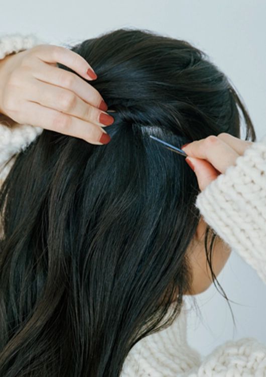 2. 1のすぐ下のサイドの髪を少量とってねじる。1と同じ位置でピンで留める。反対側も同様にし、ピンを隠すようにバレッタをつける。