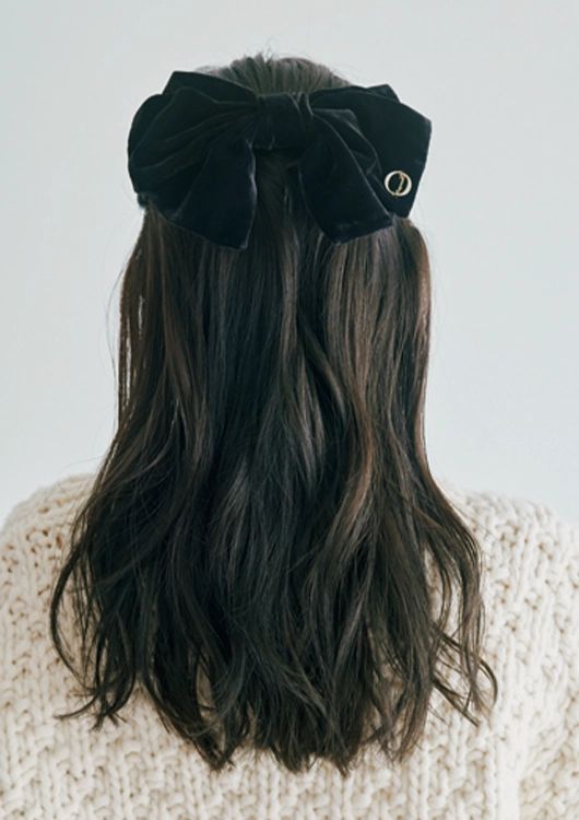 クラシカルなリボンで大人の甘さを演出。正面から見たときにリボンの端がのぞくようにつけるのがベストバランス。
