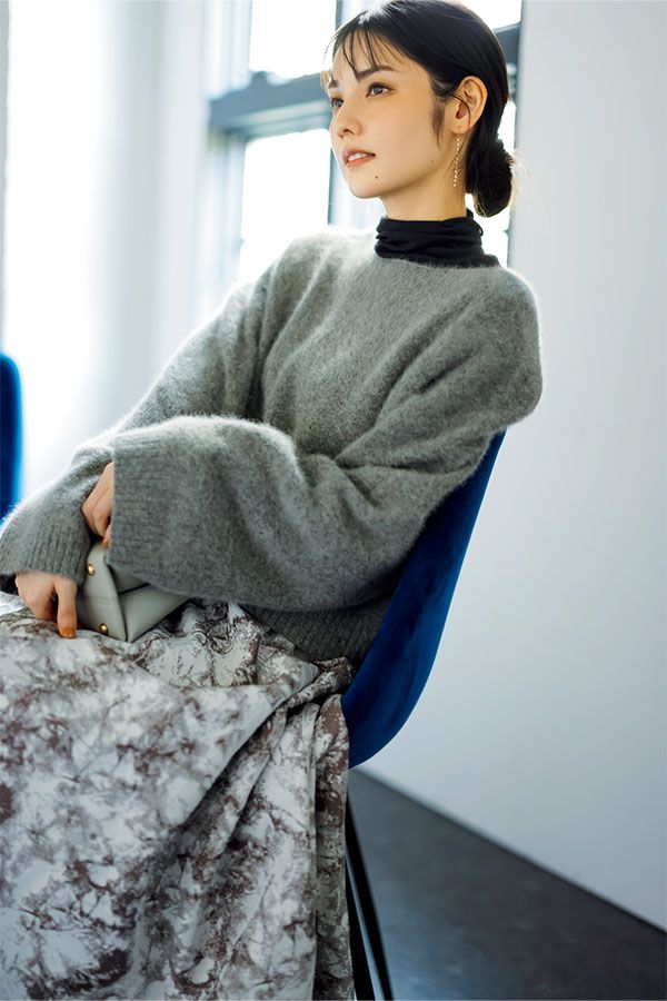 タートルニット¥3,289/ロペピクニック シャギーニット¥27,500/ストラ スカート¥19,800/JILL by JILLSTUART イヤリング¥23,100/ココシュニック バッグ¥5,800/Olu.
