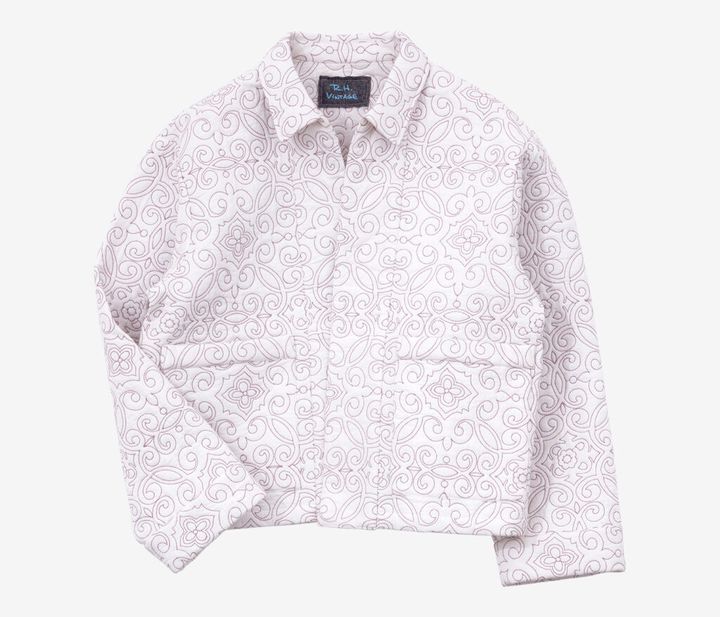 時を経て、人の手に受け継がれることを思い描いて作られる〈RH ヴィンテージ〉の服。最新コレクションで目を引いたのが、ラベンダーカラーの糸で植物柄の刺繍を施した、優しい表情のキルトジャケット。ゆとりを持たせつつも丈は短めに設定し、新鮮なバランスに仕上げている。ボタンのないデザインなので、インナーによる印象の変化を楽しみたい。