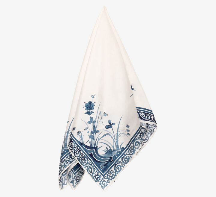旅先での出合いをかたちにしたコレクションを展開する〈マメ クロゴウチ〉。新シーズンは、17世紀前半の初期伊万里の陶片が着想源。シルクスカーフはデザイナーが描いた絵柄を型にして、栃木県足利市の職人が手捺染と呼ばれる手法で刷り上げたもの。5色の染料で表現した奥行きのある青が、器の染付を想起させる。