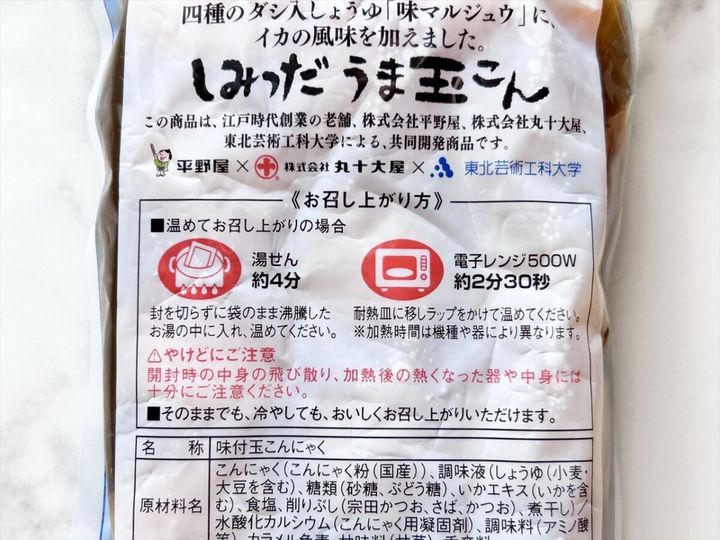 「しみっだ うま玉こん」は、こんにゃくや豆腐などを製造する平野屋と、しょうゆや味噌などを製造する丸十大屋、そして東北芸術工科大学が共同開発した商品です。パッケージデザインは、ふたつの老舗ののれんを表現しているそう。