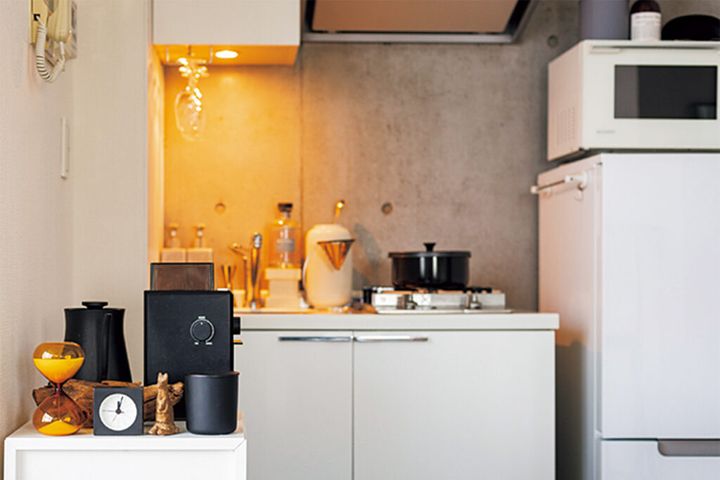 キッチンはワイングラスハンガーを後付けしてホームバー風に。コーヒーグラインダーやケトルなどの家電はシックな黒で統一。