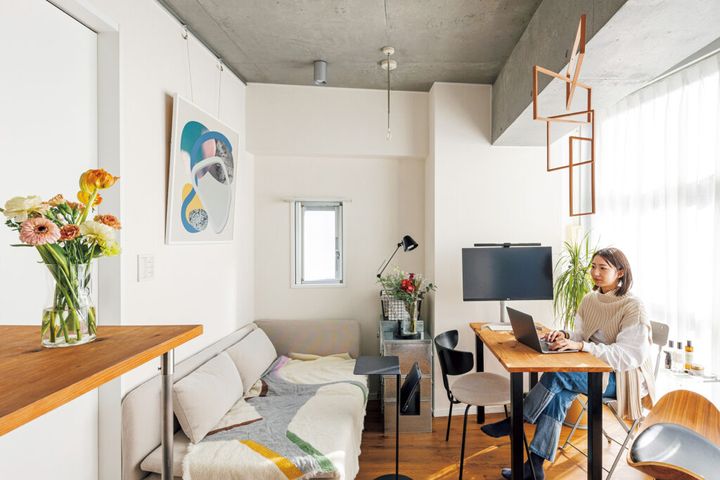 広告会社でデザイナーとして勤務しつつ、グラフィック作品を手掛けるアーティスト活動もしているtoriさん。Instagramで発信しているオシャレな自室は、数々のメディアに紹介されたことがあるインテリア上級者でもあります。「内見したときに即決しました!」というワンルームは、南向きの大きな窓による日当たりの良さが魅力だったそう。天井や梁などはコンクリート打ちっ放しながら、明るい日差しが白壁に映えて、温もりあふれる空間をつくり出しています。