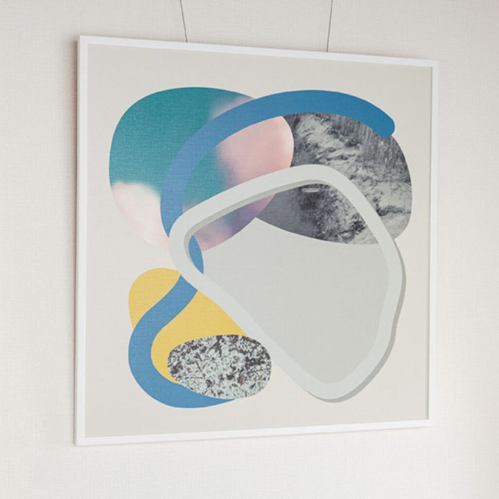 飾られているのはtoriさんの自作。旅先で出合った自然などの写真にグラフィックを組合せたコラージュを制作し、インテリアの一部として楽しめるアートを提案している。