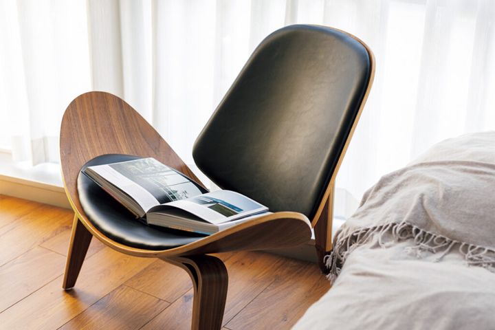 ハンス J.ウェグナーデザインの「シェルチェア」は手に届きやすいリプロダクト。読書や映画観賞などのリラックスタイムに。