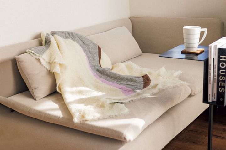 「座面が深く、ゆったりと座れるところが気に入って」というソファはIKEAで購入。ウール×アルパカによる柔らかな風合いのブランケットはtoriさんがデザインを手掛け、山梨県富士吉田市を拠点とする「Watanabe Textile」とのコラボレーションによって生まれたもの。
