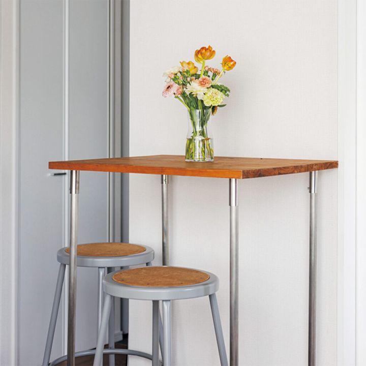 ダイニングスペースは、レストランなどで使われる業務用のハイスツールとそれに合わせて友人とDIYしたテーブルで構成。
