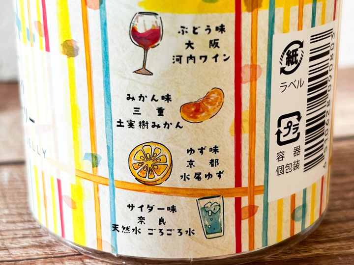 「いろどりスティックゼリー」には、奈良の「天然水 ごろごろ水」を使った「サイダー味」、京都の「水尾ゆず」の果汁を使った「ゆず味」、三重の「土実樹みかん」を使った「みかん味」、大阪の「河内ワイン」のぶどうを使った「ぶどう味」の4種類のゼリーが入っていますよ。