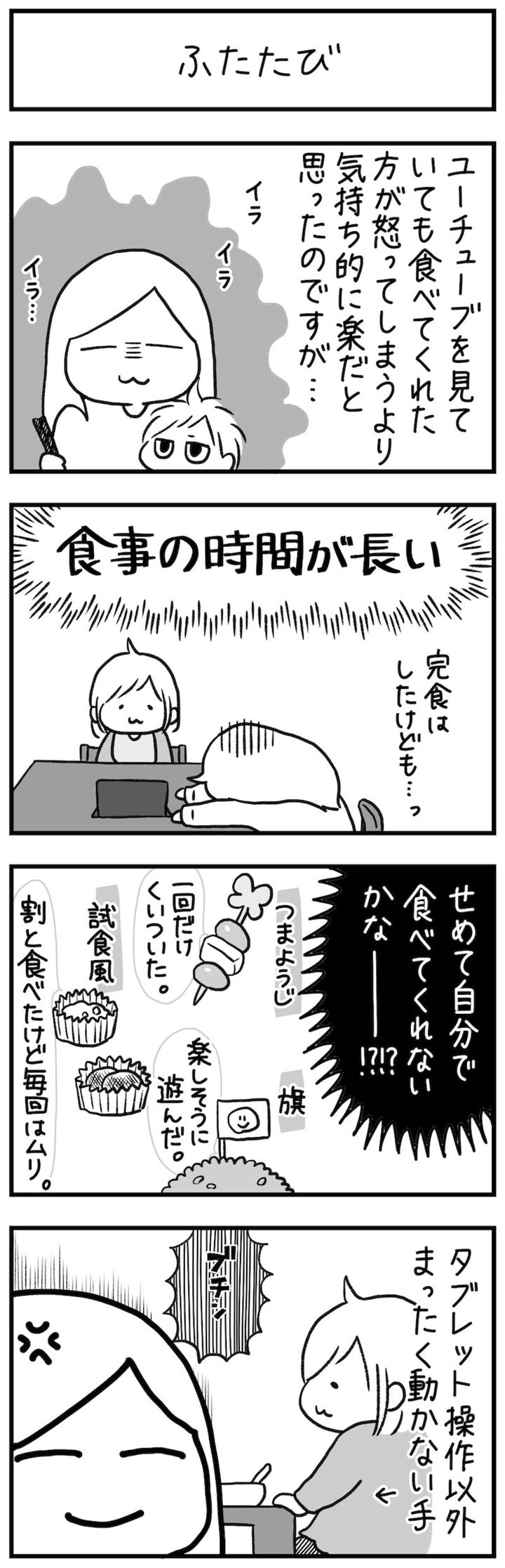 筆者の子どもも食事の時間が長く、特にテレビを見ながらだとさらに遅くなるので、やき子さんのこの疲労感がよく伝わってきます。