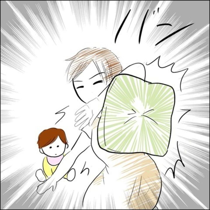 旅行の楽しい気持ちは玄関で終了。千秋さん家族の都合はお構いなしのカン太君。そんなカン太君と遊んでいたところ、突然鬼の形相の義姉が入ってきました。そしてクッションを投げつけます。