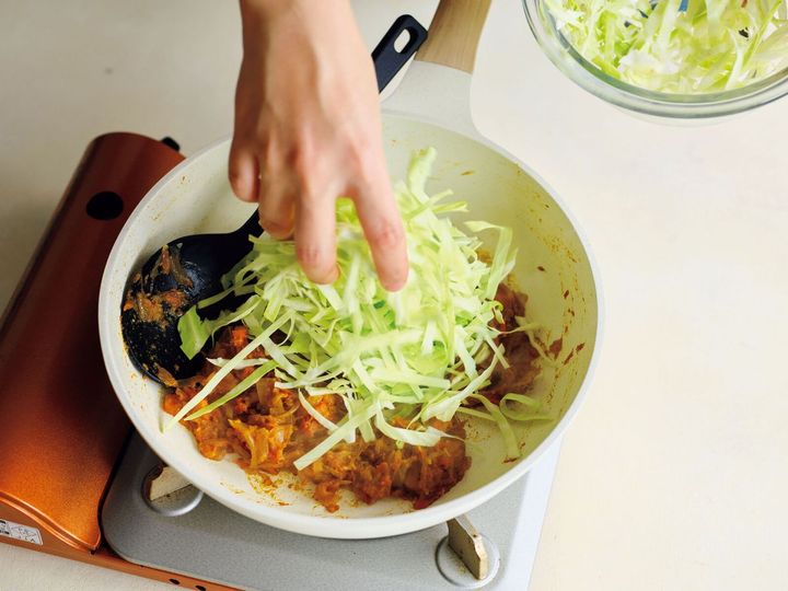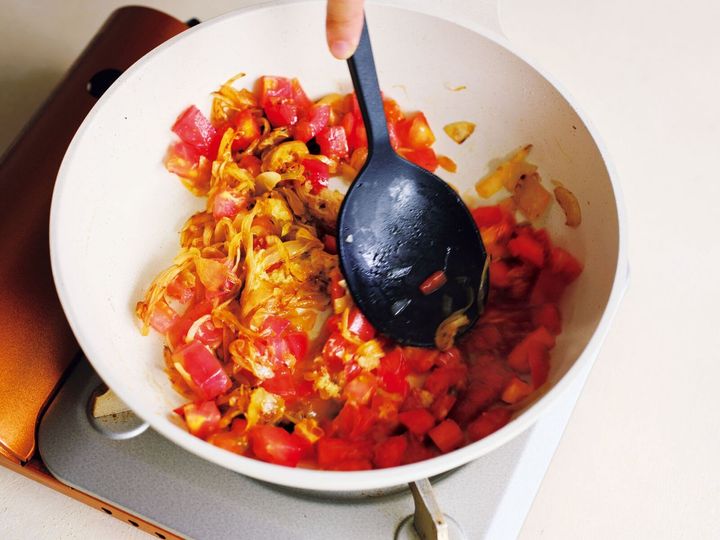 (2)フライパンにサラダ油大さじ1を強めの中火で熱し、玉ねぎを入れて10分ほど炒める。あめ色になったらトマトとAを加えて中火にし、トマトをつぶしながら(写真下)、ペースト状になるまで炒める。カレー粉と、塩小さじ1/3を加えてさっと炒め、キャベツを加えてしんなりするまで炒める。
