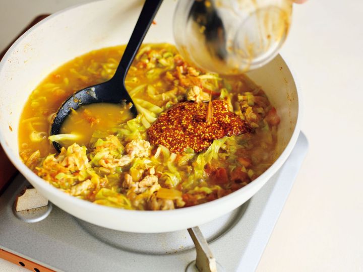 たとえば今回ご紹介するカレーは、胃と腸、どちらの働きも整えてくれる〈キャベツ〉が具の主役。さらに、カレーのベースに使う玉ねぎやトマトにも、胃の調子を整える効果が。粒マスタードの酸味がきいて、さっぱりと食べられますよ!