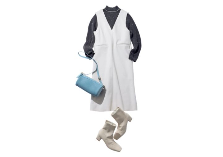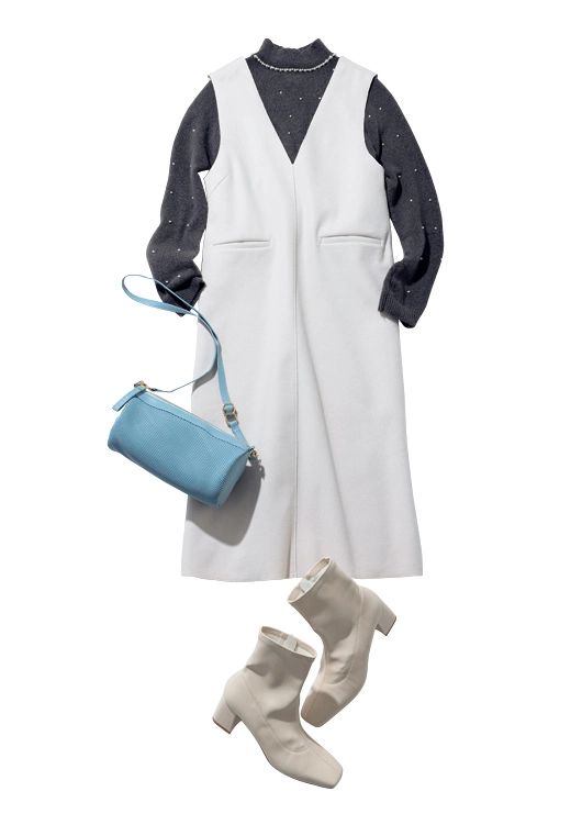 パール付きニット¥6,590/ZARA(ザラ)、ジャンパースカート¥7,150/オペーク ドット クリップ、ミニバッグ¥15,950/ペルケ(アンビリオン)、ショートブーツ¥3,990/GU