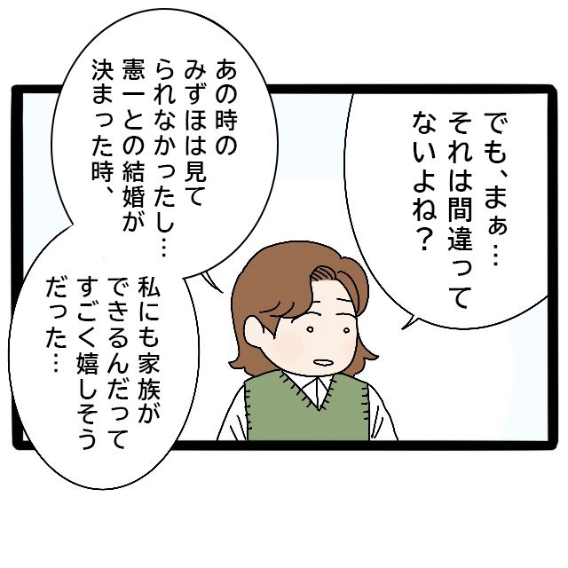 「でも、まぁ・・それは間違ってないよね?あの時のみずほは見てられなかったし・・憲一との結婚が決まった時、私にも家族ができるんだってすごくうれそうだった・・」