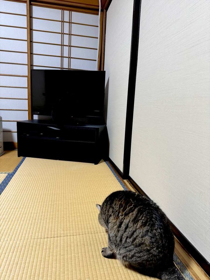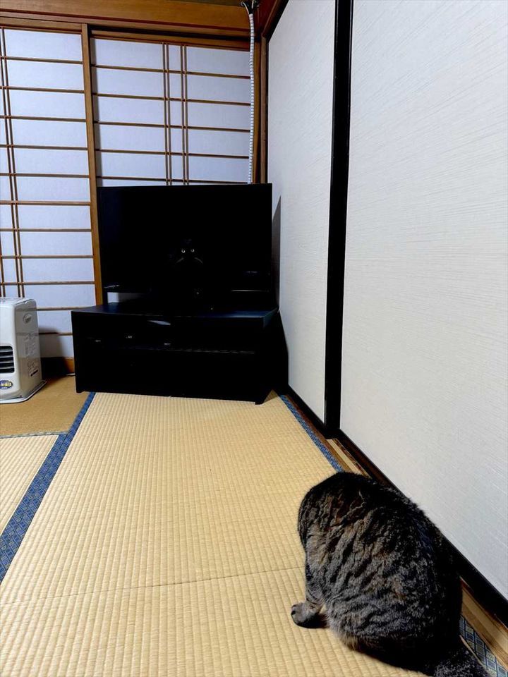 テレビにすっかり全身が溶け込んでいますね! テレビ台も黒いため、パッと見た瞬間はわかりませんでしたが、おめめやおひげの色でその場所が確認できました!!