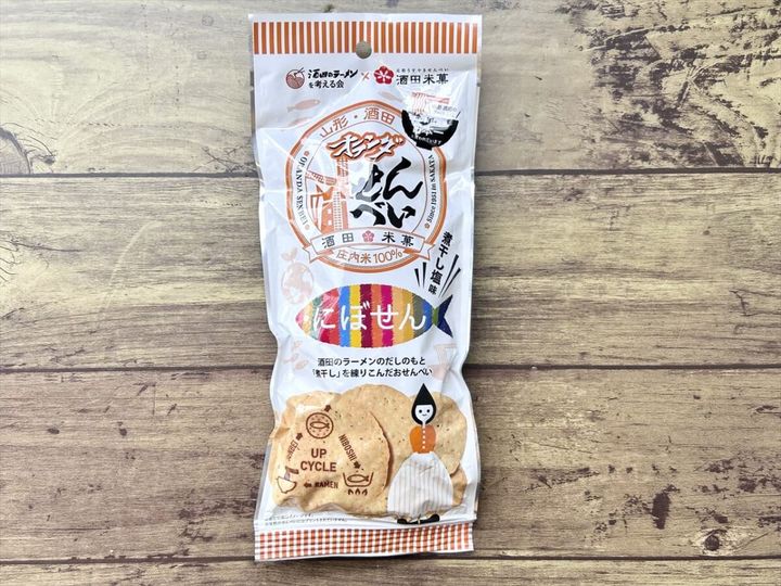 「酒田のラーメンを考える会」と「オランダせんべい」がコラボし誕生した「にぼせん」は、ラーメンスープの出汁取りとして使用した煮干しを生地へ練り込んだ、SDGs商品です。味付けには地元で採れる2種類の塩(煮干し粉末入り)を使用しているそう。