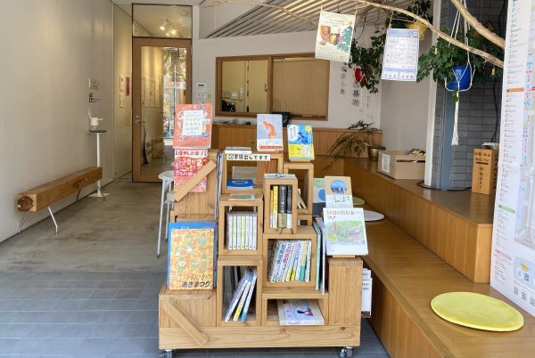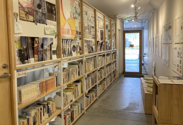さあ、中へ!扉を開くと、壁の上段にイベント情報、下段に本が並んでいました。本は、建築関係や暮らしに関するものを中心に貸し出しもされているとのこと(要登録)。