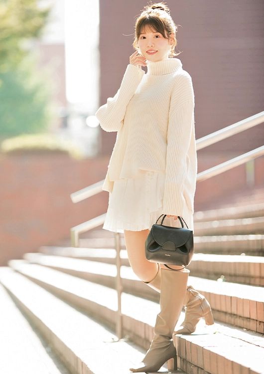 「夜景のキラキラにも負けない、オフホワイトが映えるニット+ブラウスのセットワンピコーデ。彼が守りたくなるような淡いトーンでまとめたら、ウケも間違いないはず♡仕上げに、ポレーヌの黒バックを追加して、全体をキリッと引き締めたのがポイントです」(企業受付・西沙也加さん/28歳)