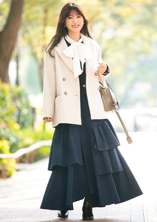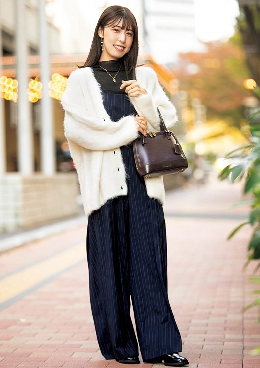 「歩き回るお買い物デートは、コラージュ ガリャルダガランテのオールインワンが欠かせません♡体のラインを拾わないイージーさが、スタイルアップも狙えて一石二鳥!清潔感のある白アウターはネイビーとも好相性で、ふわふわした手触りに気分が高まります」(IT企業勤務・松岡りなさん/32歳)