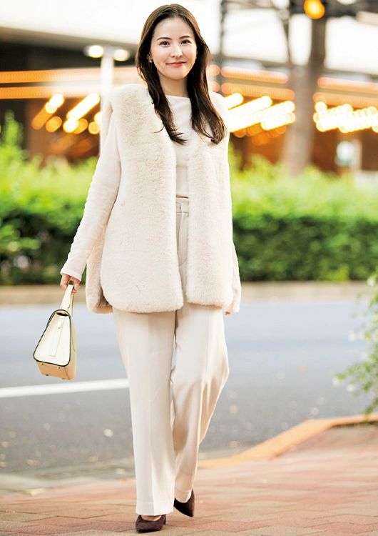 「すっきりとした同系色のコーデには、ナチュラルビューティーベーシックのファーベストで立体感を!異素材感をミックスさせたことで、メリハリをつけてみました。トップスには、透け感のあるシアーをプラスして、パンツスタイルでも女らしさを狙ってみました」(総合商社勤務・立川玲那さん/29歳)