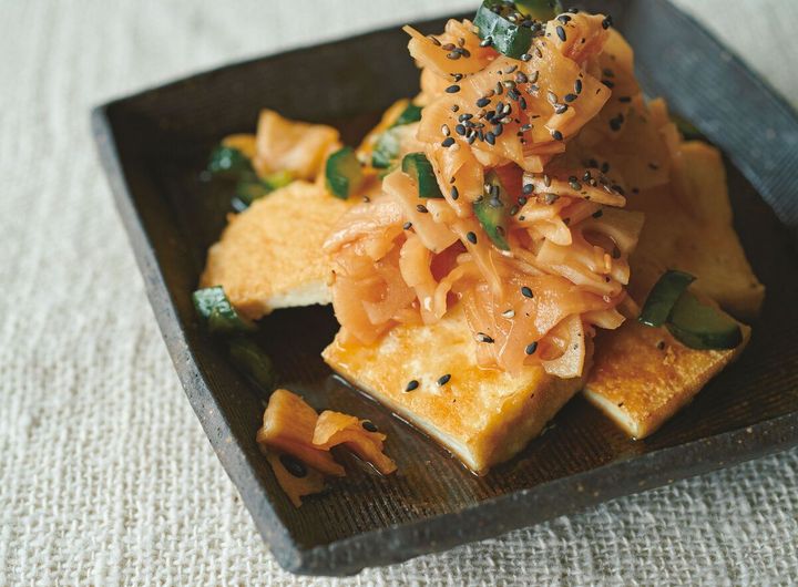 トースターや魚焼きグリルで焼き目がつくまで焼いた厚揚げに、福神漬けをたっぷりとかけ、好みで黒いりごまや七味唐辛子をふれば、気の利いたおつまみの完成です。