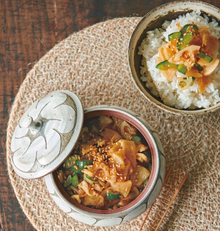 (3)清潔な保存容器に野菜としょうがを入れる。(1)の小鍋を弱めの中火にかけてひと煮立ちさせる。熱いうちに野菜に注いでなじませ、粗熱を取る。好みで白いりごまをふっていただく。
